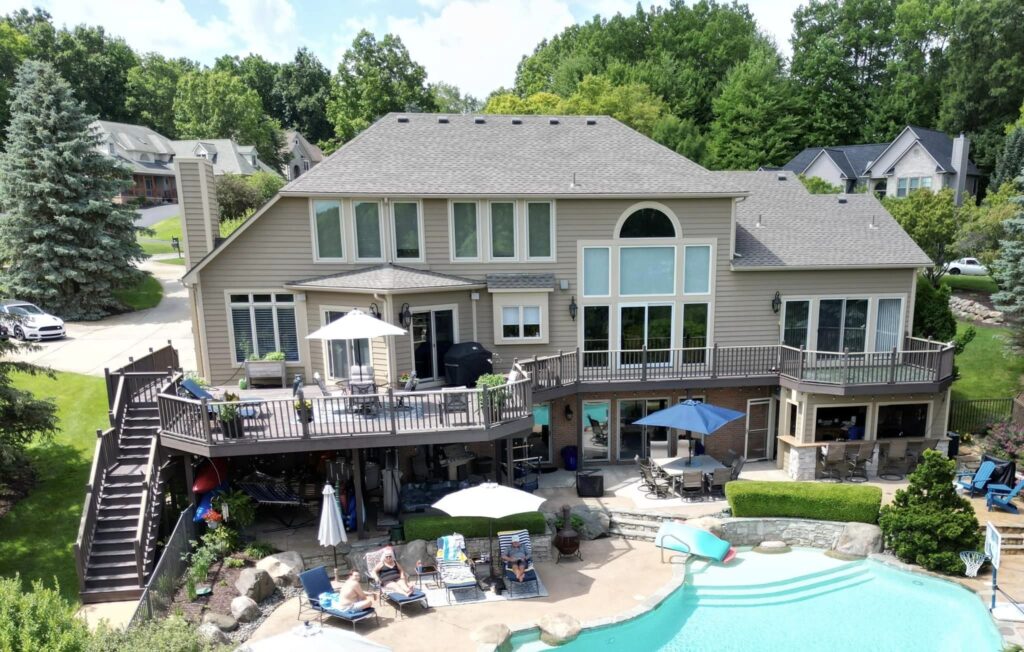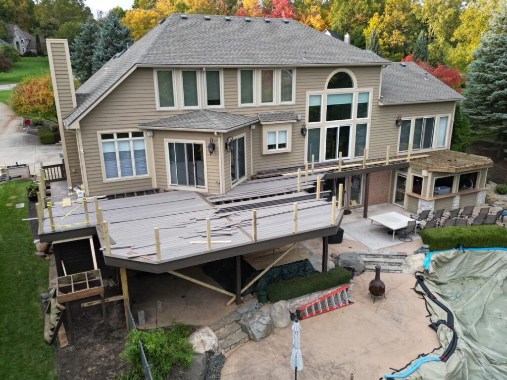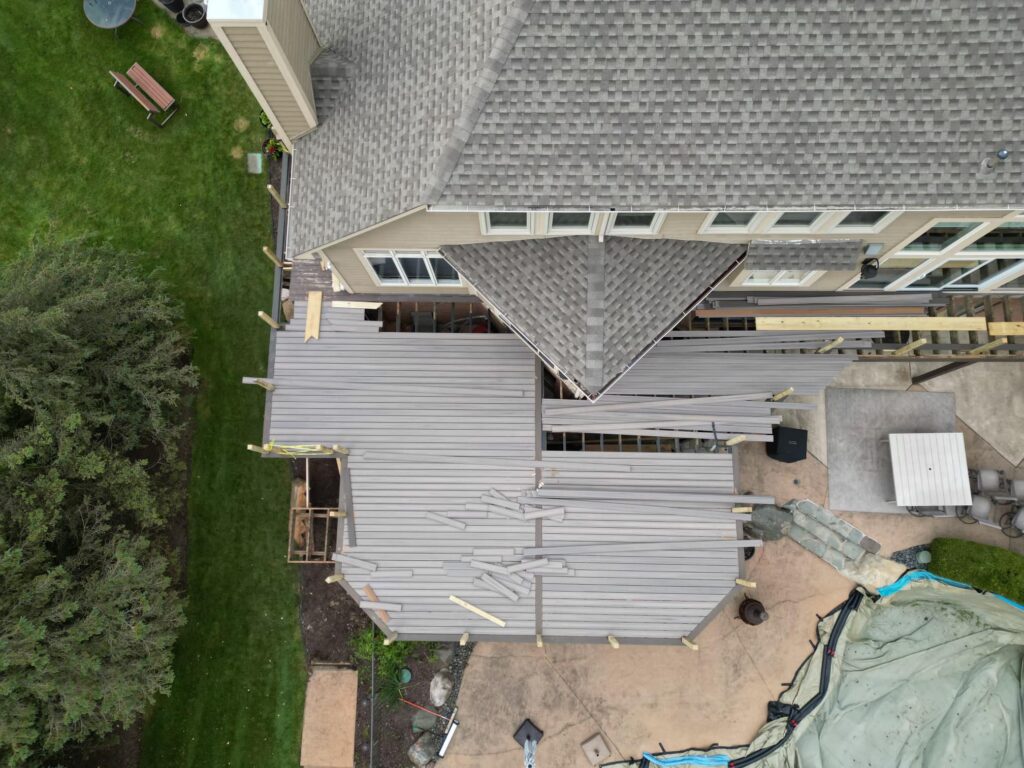 Started this huge deck(almost 1500 sq ft) at the beginning of the month. Worked on the stairs the past few days they came together pretty good! Had to replace a 6×6 & jack up the corner almost 6” then shim up the floor joist to get the dip out of it. Customer had a drone and took a few of these pictures.